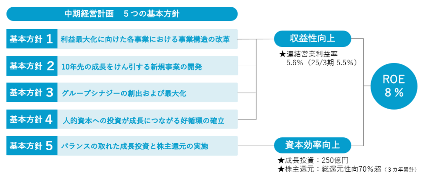 本中期経営計画は、この10年後のありたい姿の実現に向けた「収益性向上と新たな価値創出に向けた種まき」のフェーズとして位置付けております。